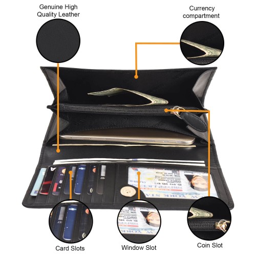 • STORAGE CAPACITY: This Continental wallet has extra capacity for all of your essentials. This Wallet Comprises a snap closure, 1 id window, 13 credit card slots, 2 gusseted pockets and 1 zipper coin pocket, 4 large bill compartment to hold a certain amount of bills/receipts, backside a full width zippered pocket.